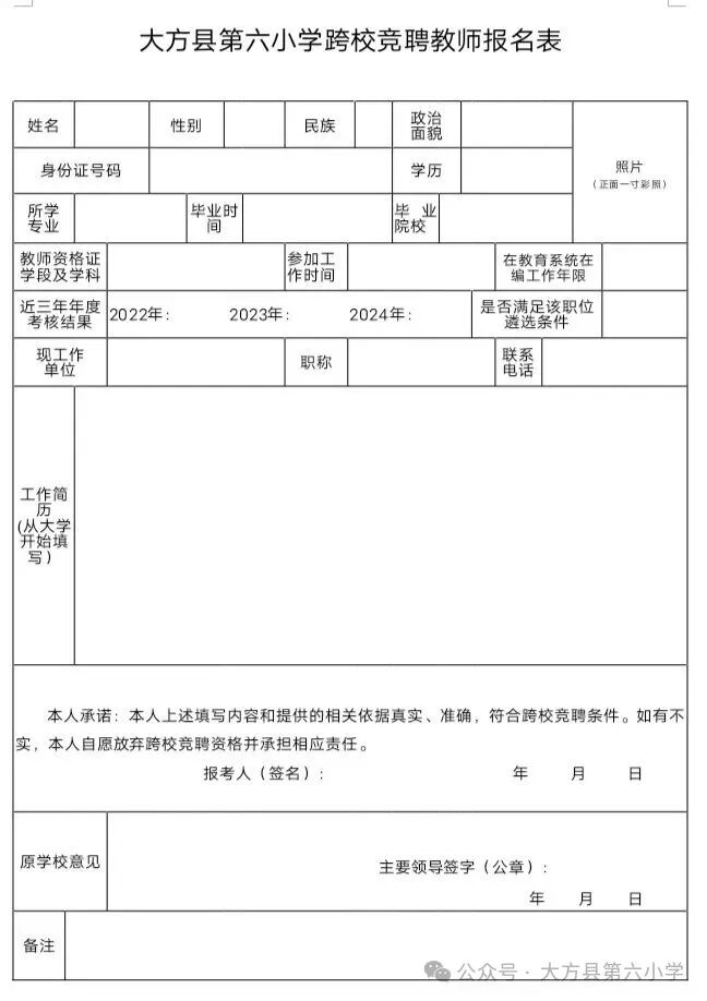 三是《大方县第六小学跨校竞聘教师报名表》纸质版1份;