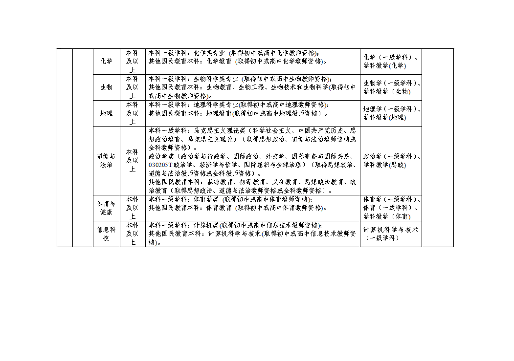 5.报考人员参加报考学科笔试。笔试科目为道德与法治、语文、数学、英语、地理、科学、物理、化学、生物学、信息科技、体育与健康等11个学科。考试科目不分学段。