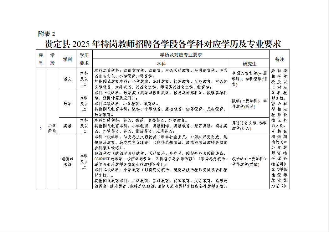 (三)学历条件。初中、小学阶段要求本科及以上学历,以师范类专业为主。招聘岗位学历及专业要求详见《贵定县2025年特岗教师招聘各学段各学科对应学历及专业要求》(附表2)。