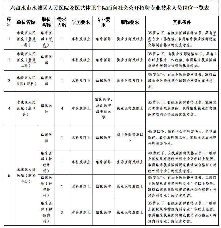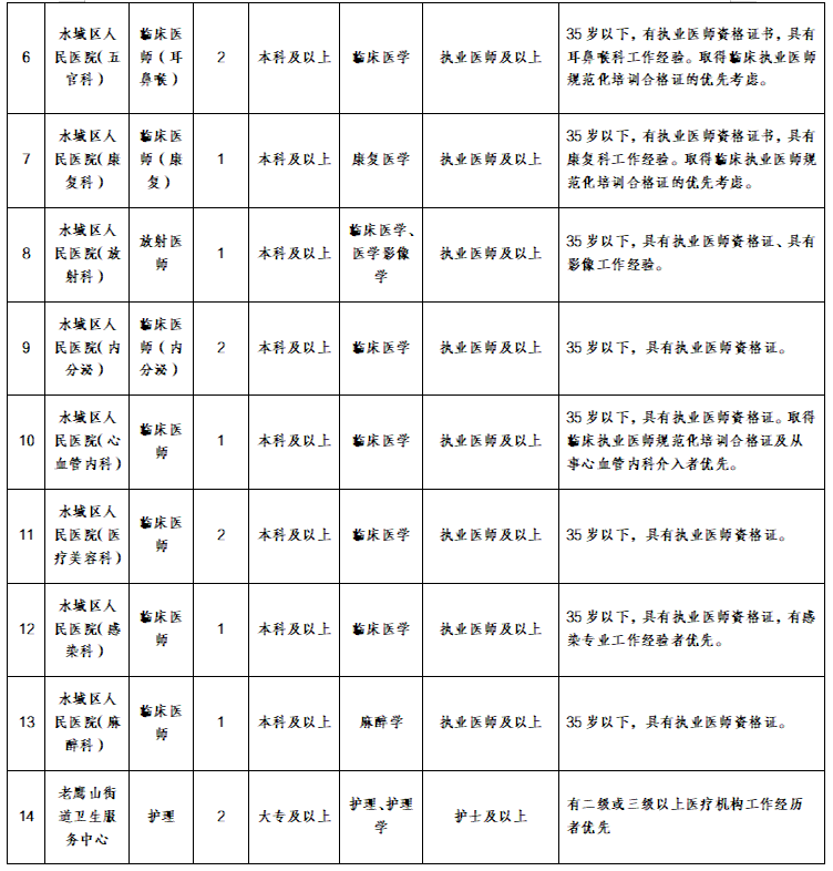 (1)水城区人民医院招聘人员年龄35岁及以下,取得中级职称人员年龄放宽到40岁及以下。取得副高级职称人员年龄放宽到45岁及以下。取得正高级职称人员年龄放宽到50岁及以下。