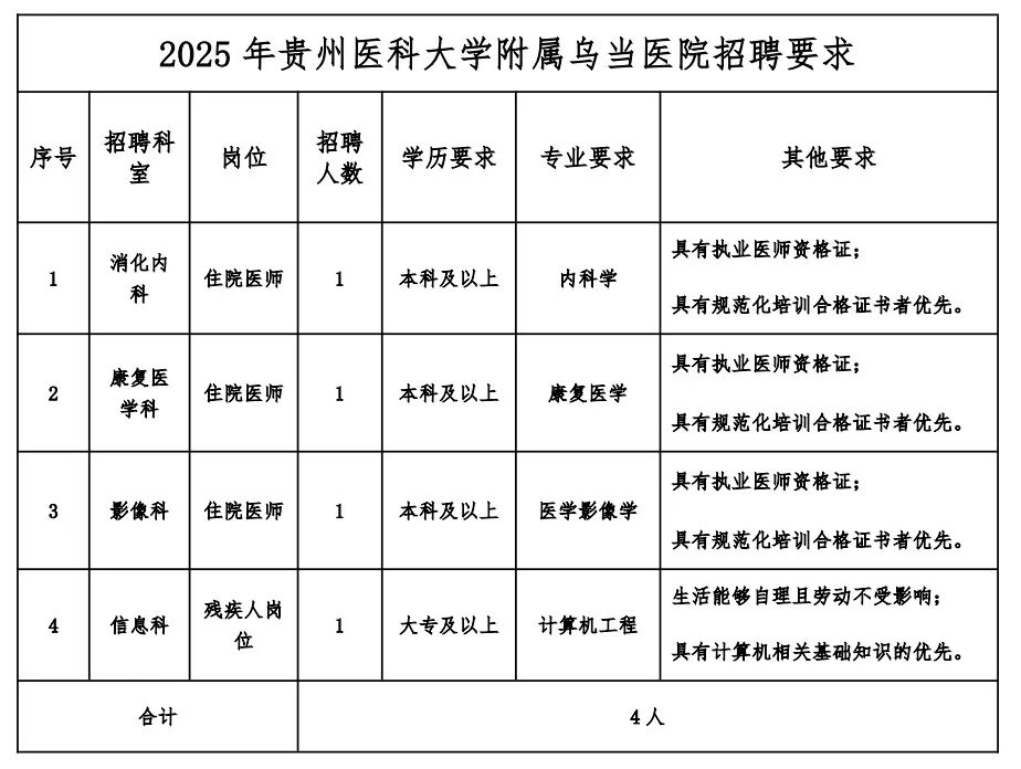 贵州医科大学附属乌当医院招聘合同制员工4人