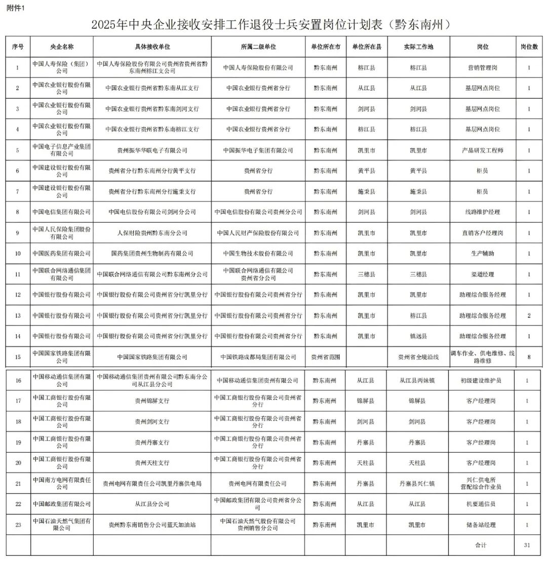 一、2025年中央企业接收安排工作退役士兵安置岗位计划表(黔东南州)