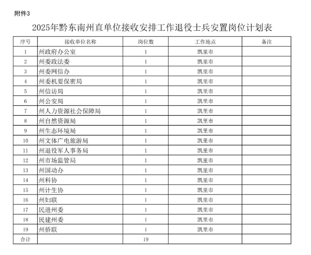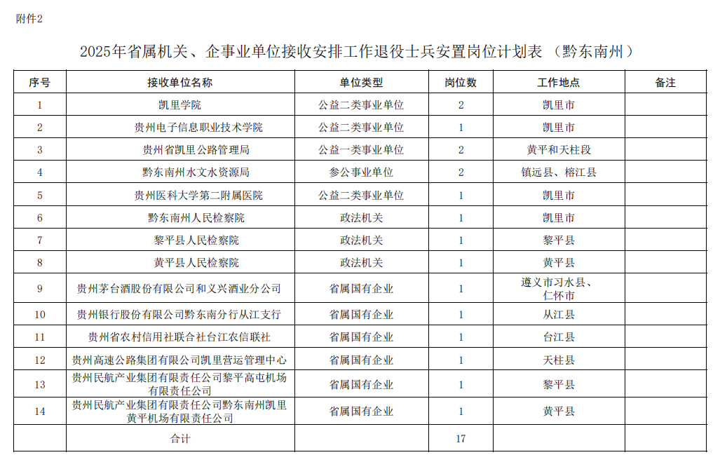 2025年中央企业、省属机关、企事业单位和州直单位接收黔东南州安排工作退役士兵安置岗位计划公示
