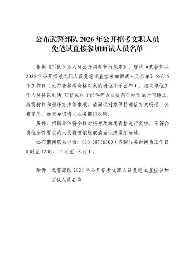 武警部队2026年公开招考文职人员免笔试直接参加面试人员名单